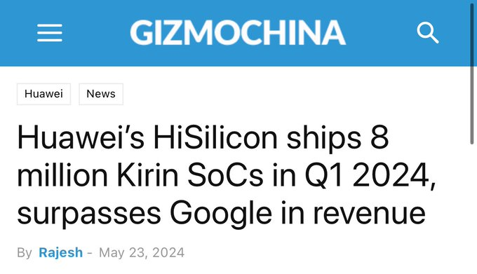 A HUAWEI HiSilicon envia 8 milhões de SoCs Kirin no primeiro trimestre de 2024, mostrando sinais de recuperação com aumentos em comparação com os trimestres anteriores.