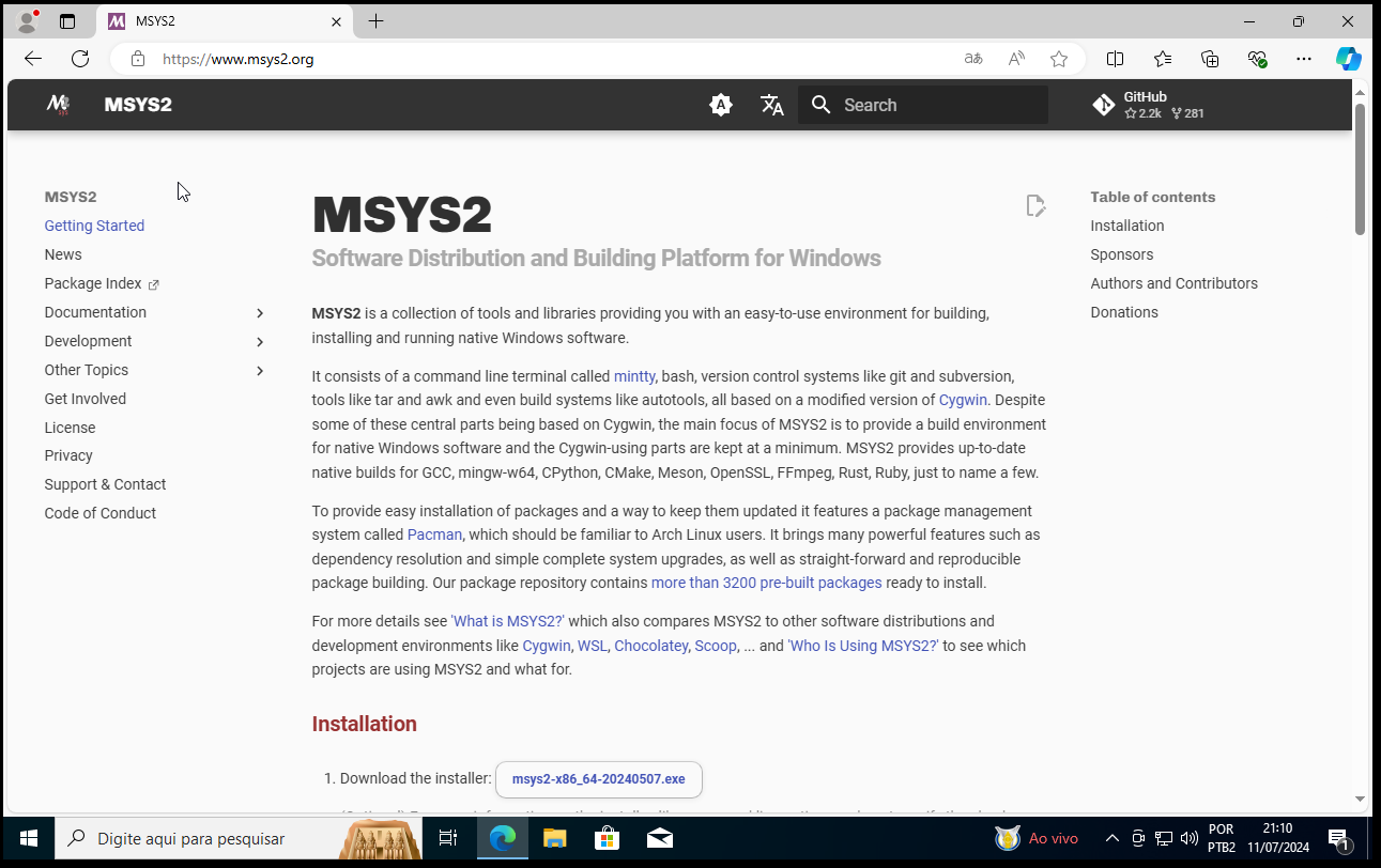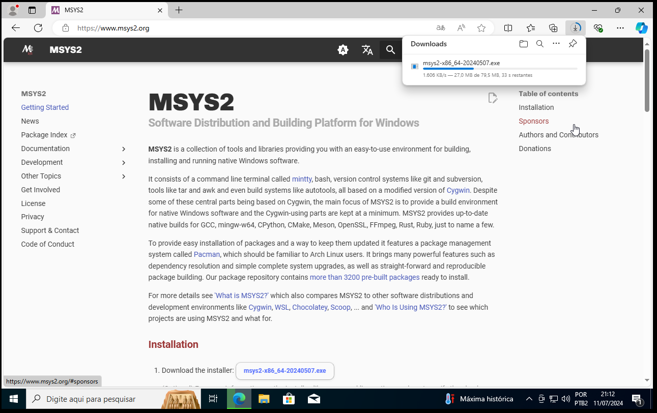 Estou usando maquina virtual ZERADA! Pagina do Msys2 Baixando o arquivo de instalação. Saudações,