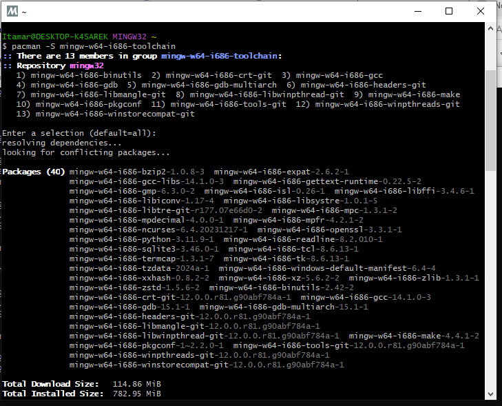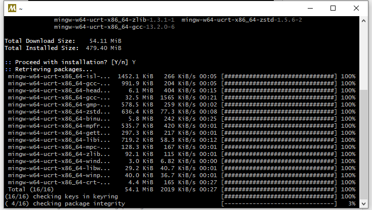 Está baixando a versão GCC UCRT64... Saudações,$ pacman -S mingw-w64-ucrt-x86_64-gcc