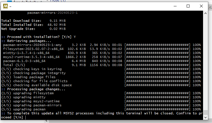 pacman -Suy Como ele ATUALIZOU o MSYS2(Terminal) ele precisa fechar para aplicar as atualizações.(Reiniciar)