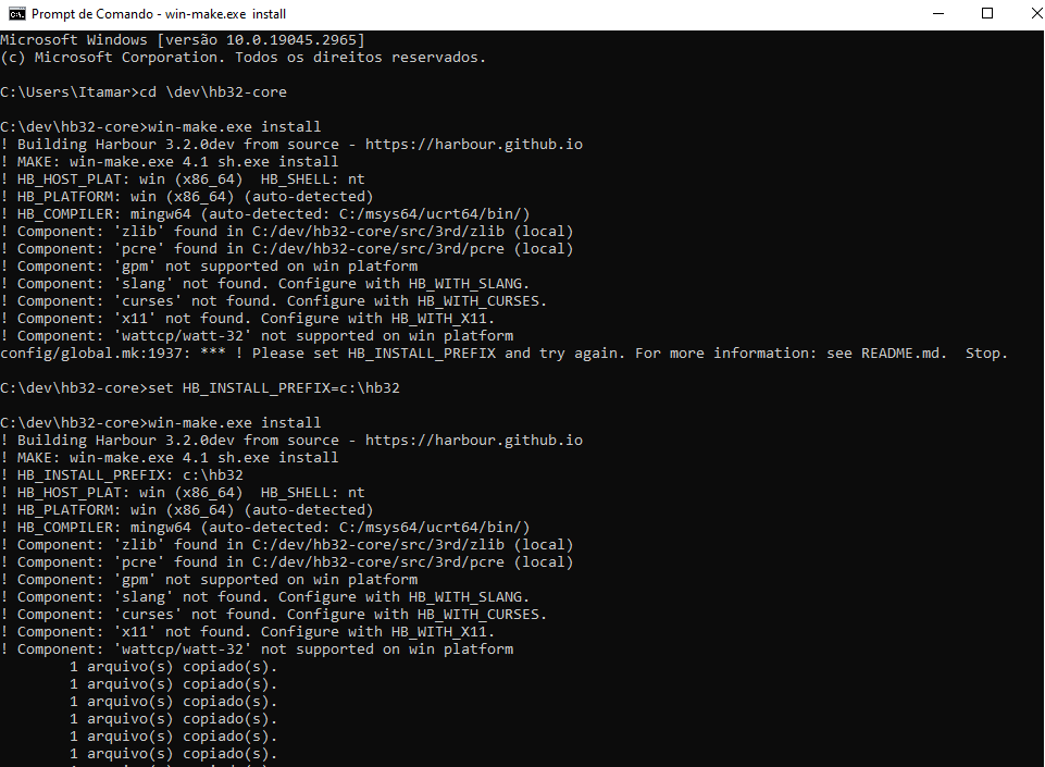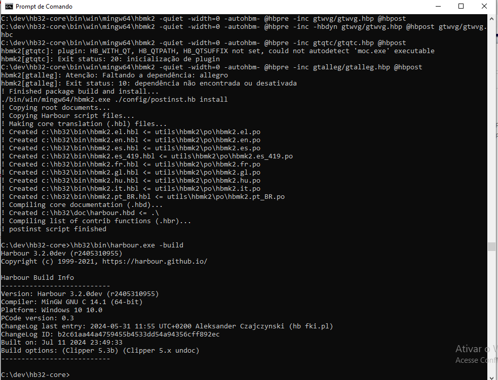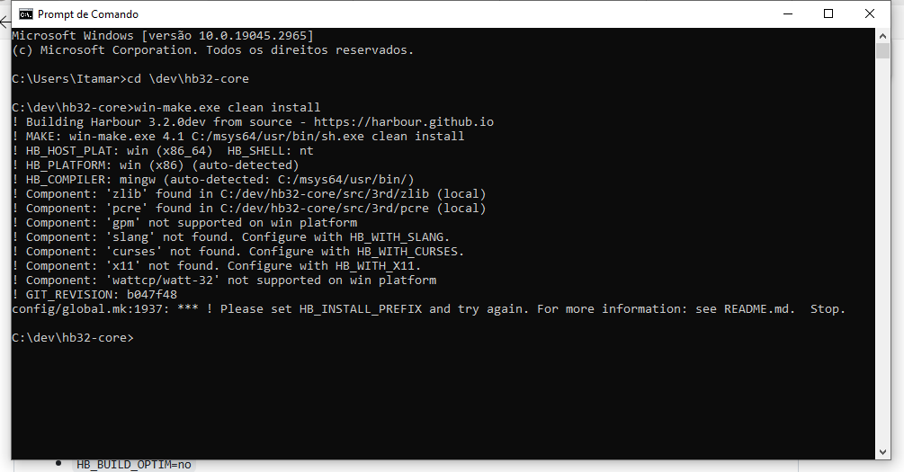 c:\msys64\mingw32\bin Testando... Repare que tá pedindo o tal HB_INSTALL_PREFIX! Mas tudo que precisa já foi automaticamente identificado.