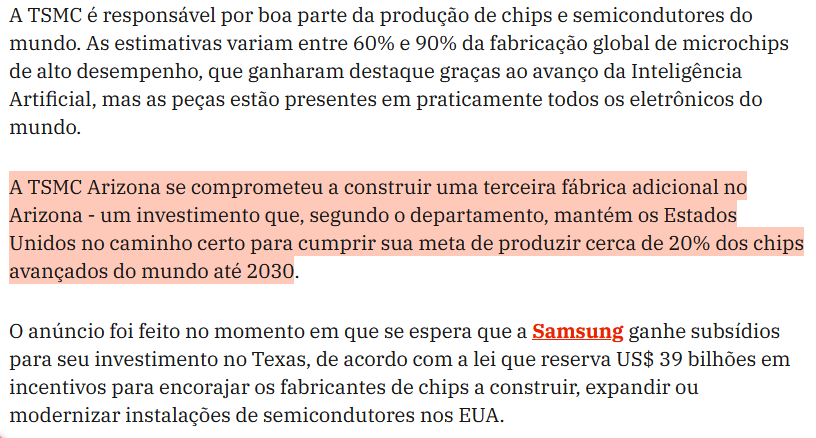 USA não tem nenhuma fabrica de CHIPs, todos estão em Taiwan. Agora a Taiwan está investido bilhões(Diga-se governo dos USA) para construir as fábricas... Mas não tem nem mão de obra....