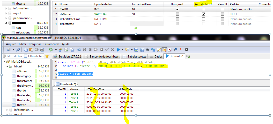 Porque aqui a data funcionou com 0000-00-00, mesmo com not null