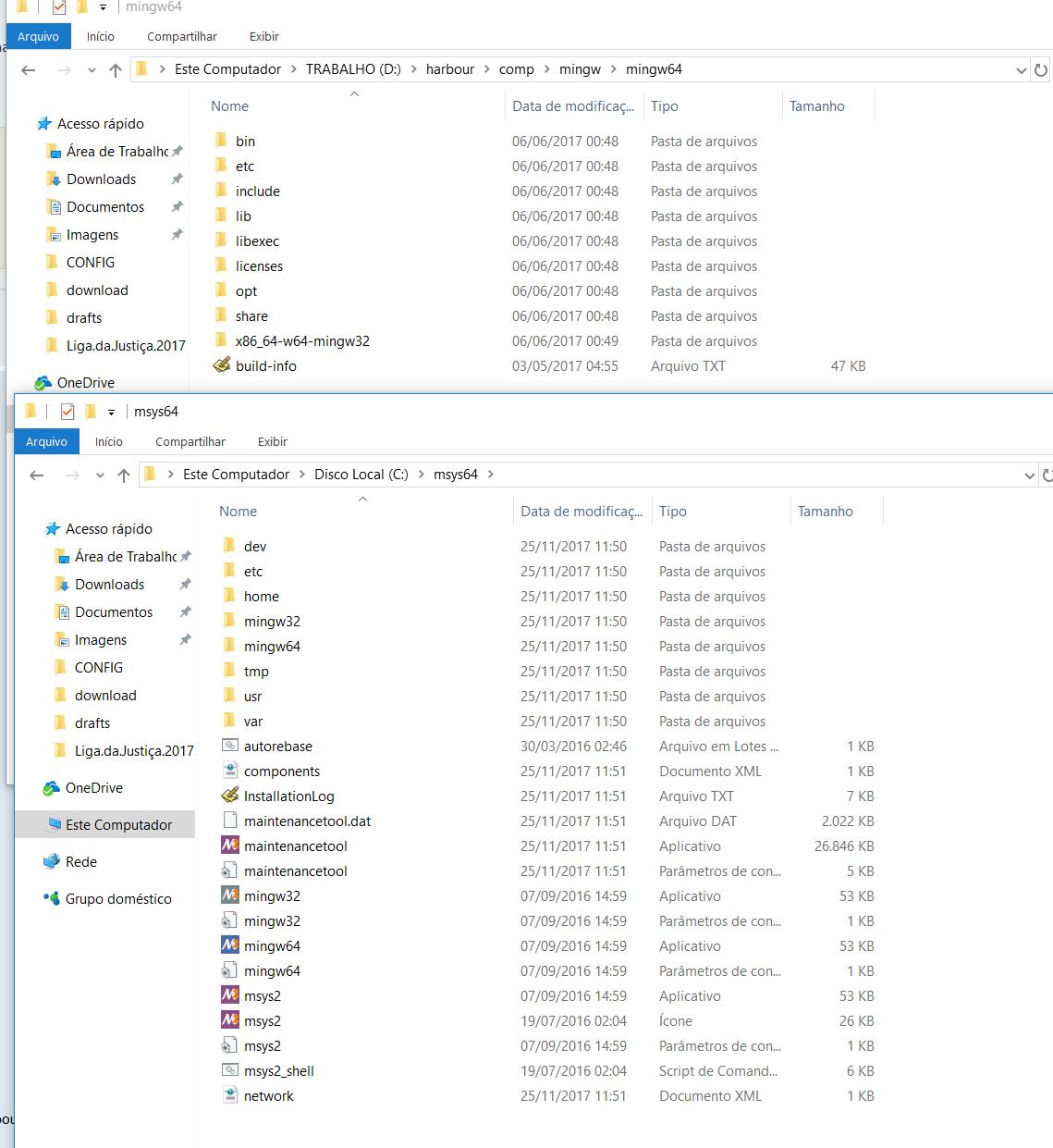 Na pasta do MSYS64 tem as pastas mingw32 e mingw64