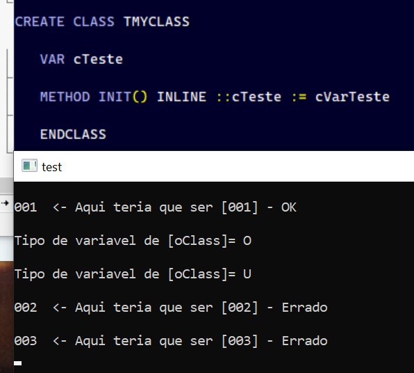 ? oClass:cTeste, " <- Aqui teria que ser [001] - OK"