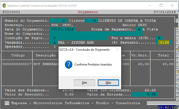 no à vista quando é terminado o cadastro de produtos, a função PEDE_OPÇÃO que é pra gravar ou não o orçamento, não é apresentado e tudo é cancelado, como se fosse pressionado um ESC. Vejam a imagem abaixo no momento em que é perguntado se é pra confirmar os produtos, e, sempre usei o ESC para sair desses GETs que são dentro dos GETs iniciais: