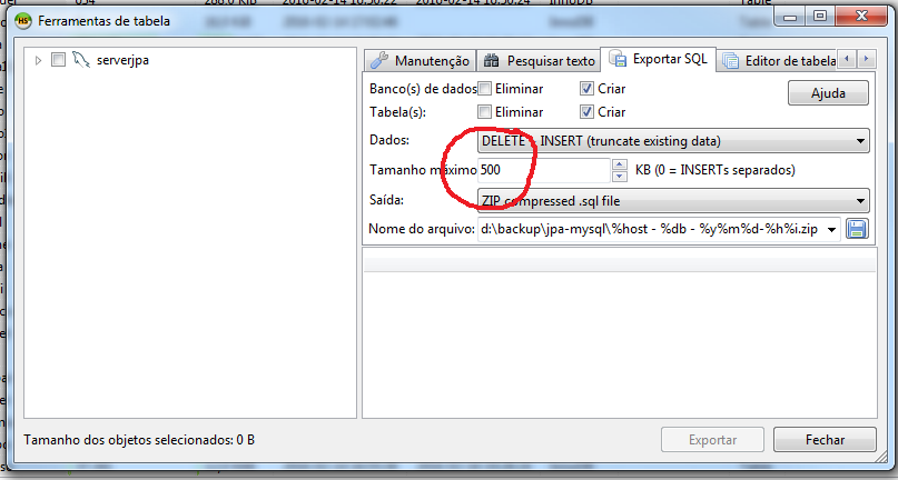 Backups eventuais, ou no meu servidor, uso o HeidiSQL, agora marcando isso de 500kb.