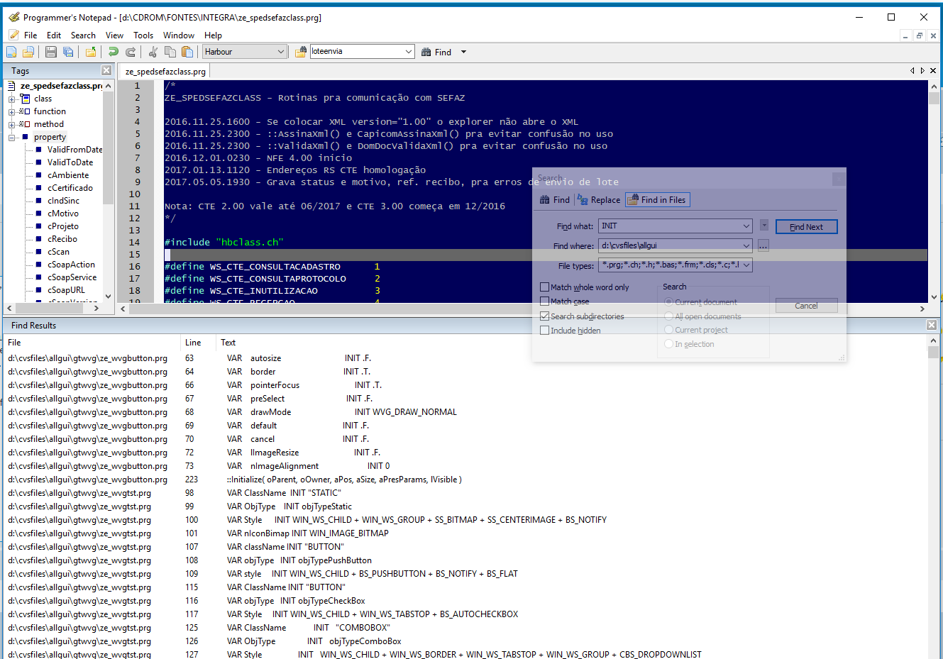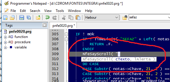 Repare na facilidade de identificar o fonte na pesquisa do Programmers Notepad., e a pesquisa transparente, porque cliquei pra mexer no fonte sem fechar a janela de pesquisa (poderia ser pesquisar a mesma palavra em várias partes do fonte e já ir alterando em cada parada)