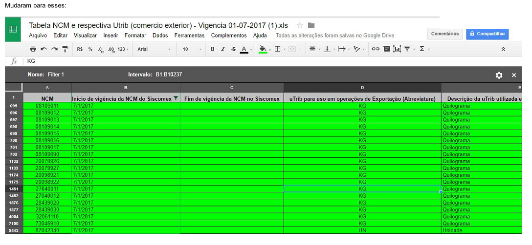 Na tabela divulgada dia 07/07/2017 faltava, por engano, 13 linhas correspondendo à faixa de NCMs 0811.1000 a 0814.0000 e deixou de ser informado que foram extintos os códigos 0810.9000, 2704.0010, 3206.1111, 3206.1119, 7304.5911, 7304.5919.