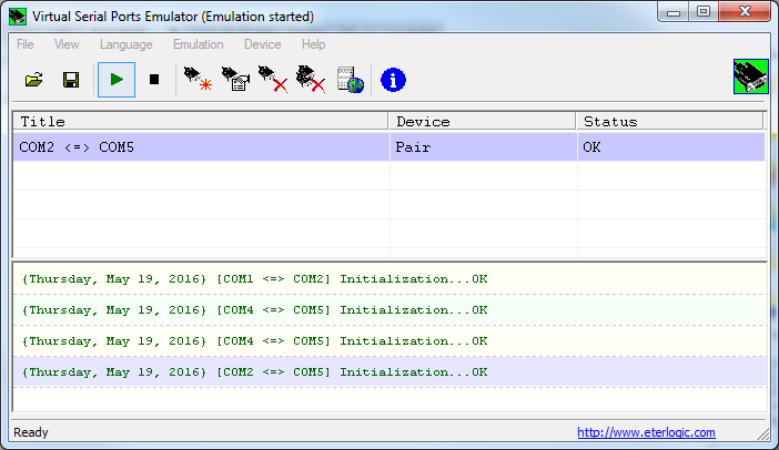Você poderia testar outro virtualizador como o Virtual Serial Ports Eltima?