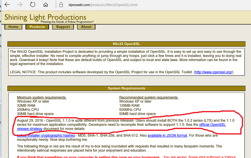 Só compila sem erro até a versão OpenSSL-Win32 - 1.0.2k