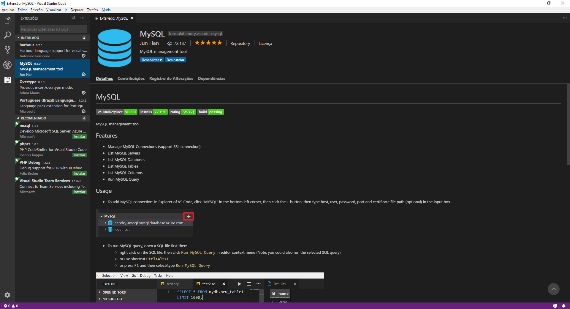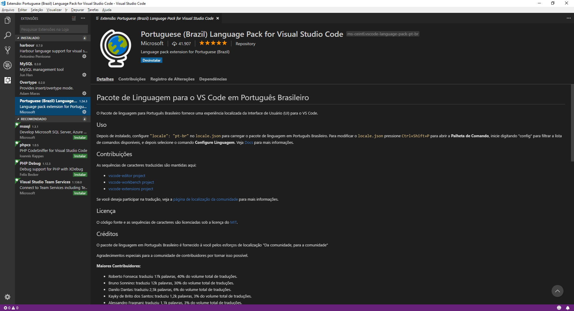 2º) Idioma: Após a instalação ele sugere que vc use a extensão para o idioma português do Brasil, baixa essa extensão e instala que o VSC fica todo em português. 3º) Extensão Habour: Instale esta extensão que eu instalei, parece ser a melhor, não testei as outras. 4º) Extensão MySQL: Depois disso, vc pode baixar e instalar a extensão MySQL 5º) Projeto: Com o VSC aberto, tem vários jeitos de vc trabalhar: