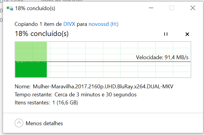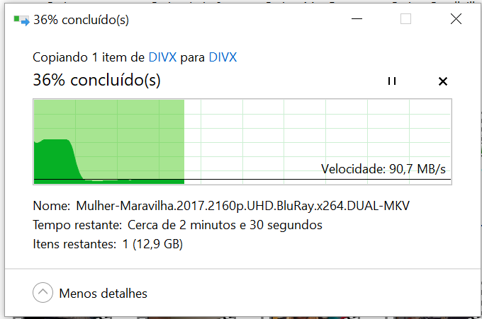 A velocidade de cópia foi 1MB com arquivos pequenos, e 90MB com um arquivo único de 20GB.