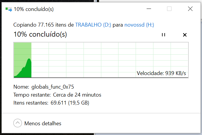 A velocidade de cópia foi 1MB com arquivos pequenos, e 90MB com um arquivo único de 20GB.
