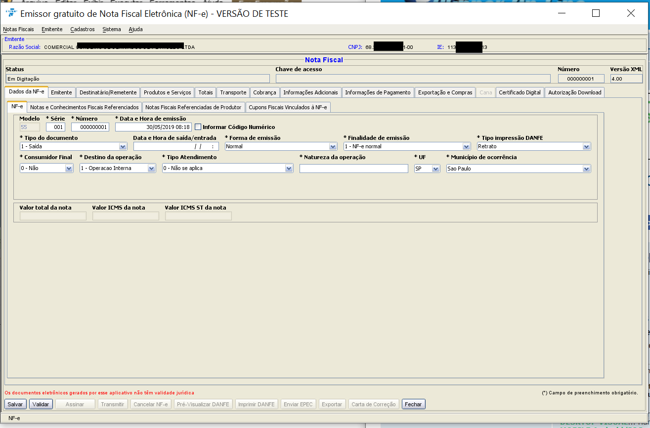 Lembrando: Estas telas são do emissor de NFE do Sebrae em 30/05/2019, deverão ser diferentes até o final do ano.