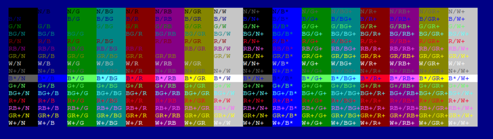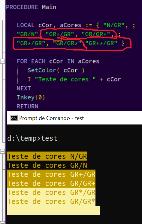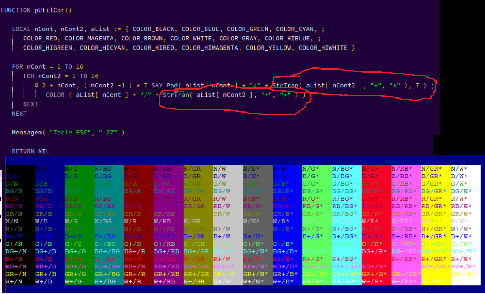 COLOR ( aList[ nCont ] + "/" + StrTran( aList[ nCont2 ], "+", "*" ) )