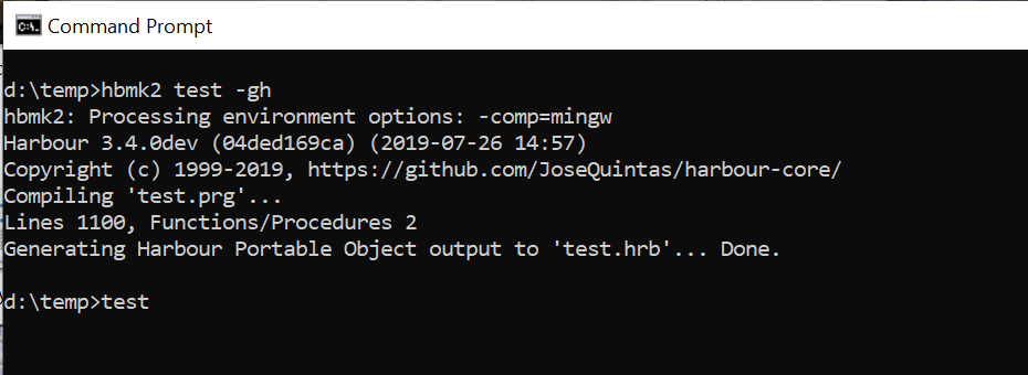 Generating C source output to 'C:\Users\jmcqu\AppData\Local\Temp\hbmk_0f2yys.dir\test.c'... Done.