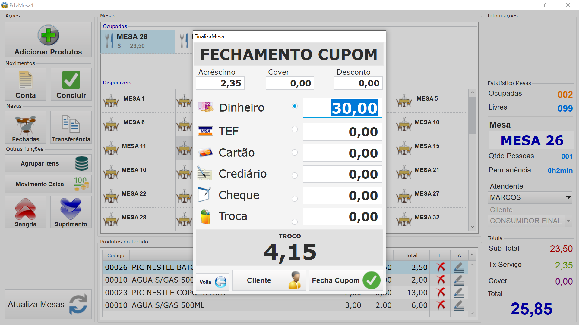 Além de ter um sistema bom, é necessário muitas outras coisas. Já vi garçom tomando bebidas, comandadas por eles no código de outro garçon... é tanta coisa mais tanta coisa..., chamado técnico 01:00 da manhã!... e por ai vai... Fui saindo disso tudo e só tenho pouquíssimos clientes...