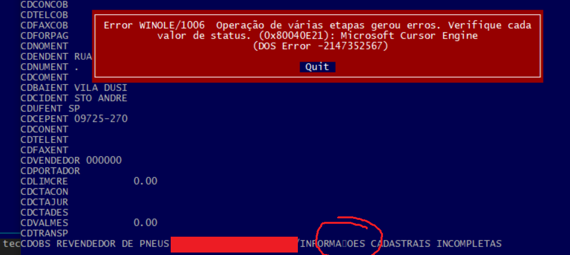 O erro, que parece um problema anormal "operação de várias etapas gerou erros".