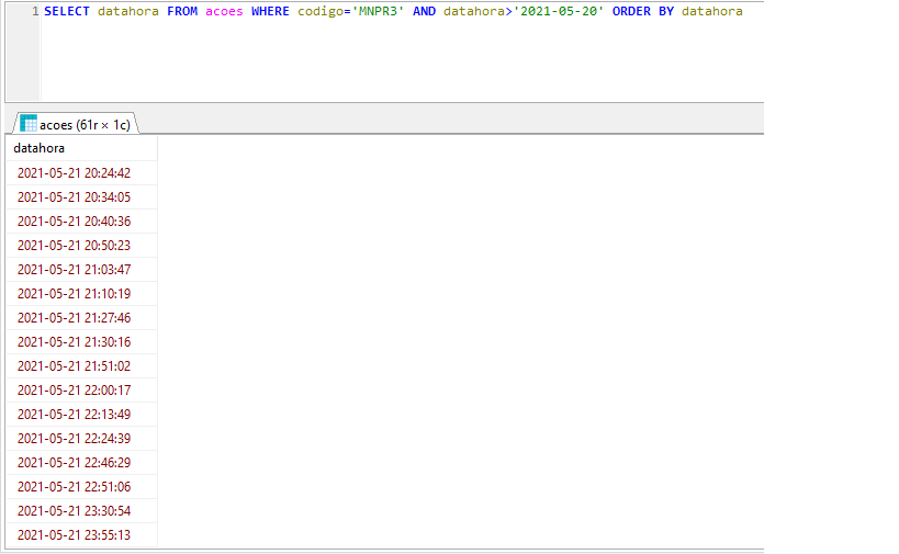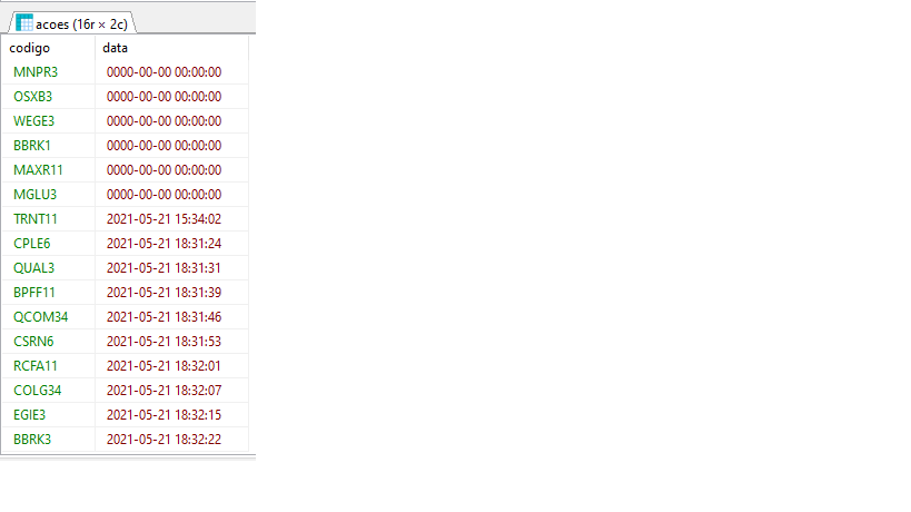 Neste instante, o resultado está saindo como no primeiro anexo. Observe, por exemplo, o código MNPR3, que está dando data=000000. Mas, consultando especificamente este código, tem várias registros com data de hoje (vide resultado2 no anexo).select codigo,max(datahora) as data from acoes use index (coddt) where marca='V' and hrvisto<>91234 group by codigo order by data
