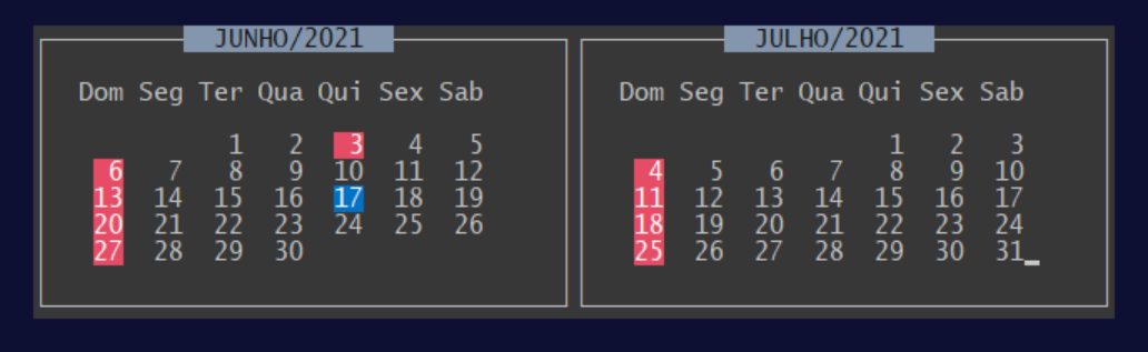 "| DOM SEG TER QUA QUI SEX SAB | DOM SEG TER QUA QUI SEX SAB | DOM SEG TER QUA QUI SEX SAB |" +;