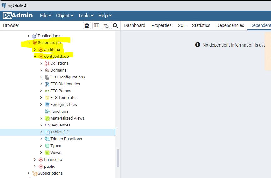 No PostgreSQL tem um recurso interessante, chamado SCHEMA. Diferentemente do MySQL e MariaDB, onde cada database existente no servidor é chamado de SCHEMA, no PostgreSQL, pode-se criar quantos schemas forem necessários dentro de cada database. Dentro de cada Schema, pode-se criar tudo que for preciso para aquele schema, como tables, views, triggers, functions, etc... Desta forma, pode-se dividir e agrupar os objetos como for necessário e com facilidade. O schema padrão é o Public.