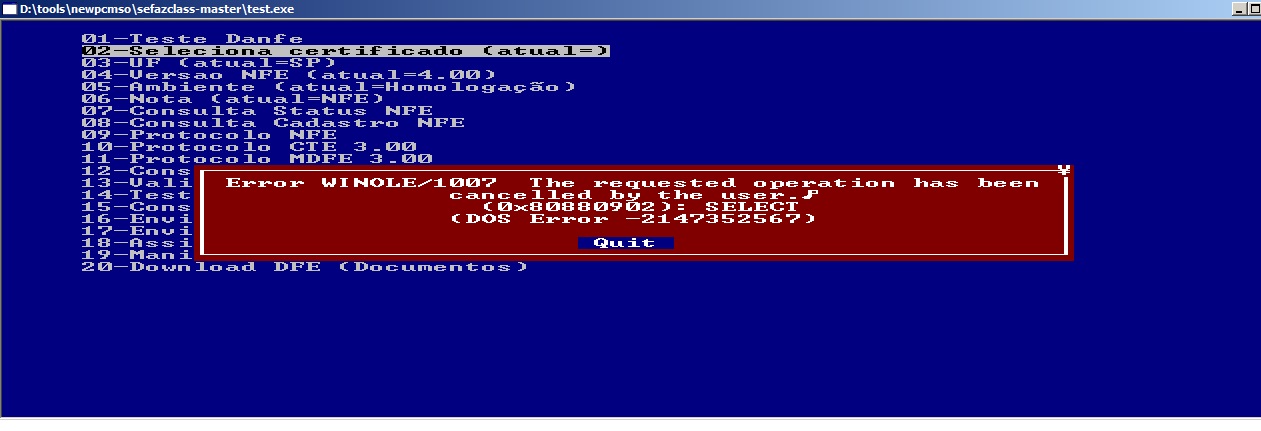 Boa tarde, usando o programa test.exe, opção 02 - seleciona certificado. Ao clicar e tiver mais de um certificado instalado, irá listar todos os mesmos. Se clicar em cancelar ou sair do form dá erro. Tem como corrigir este problema?