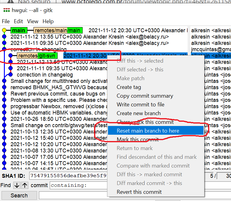 Depois a opção: reset main to here, isso faz com que a posição atual, LOCAL, seja essa nova.