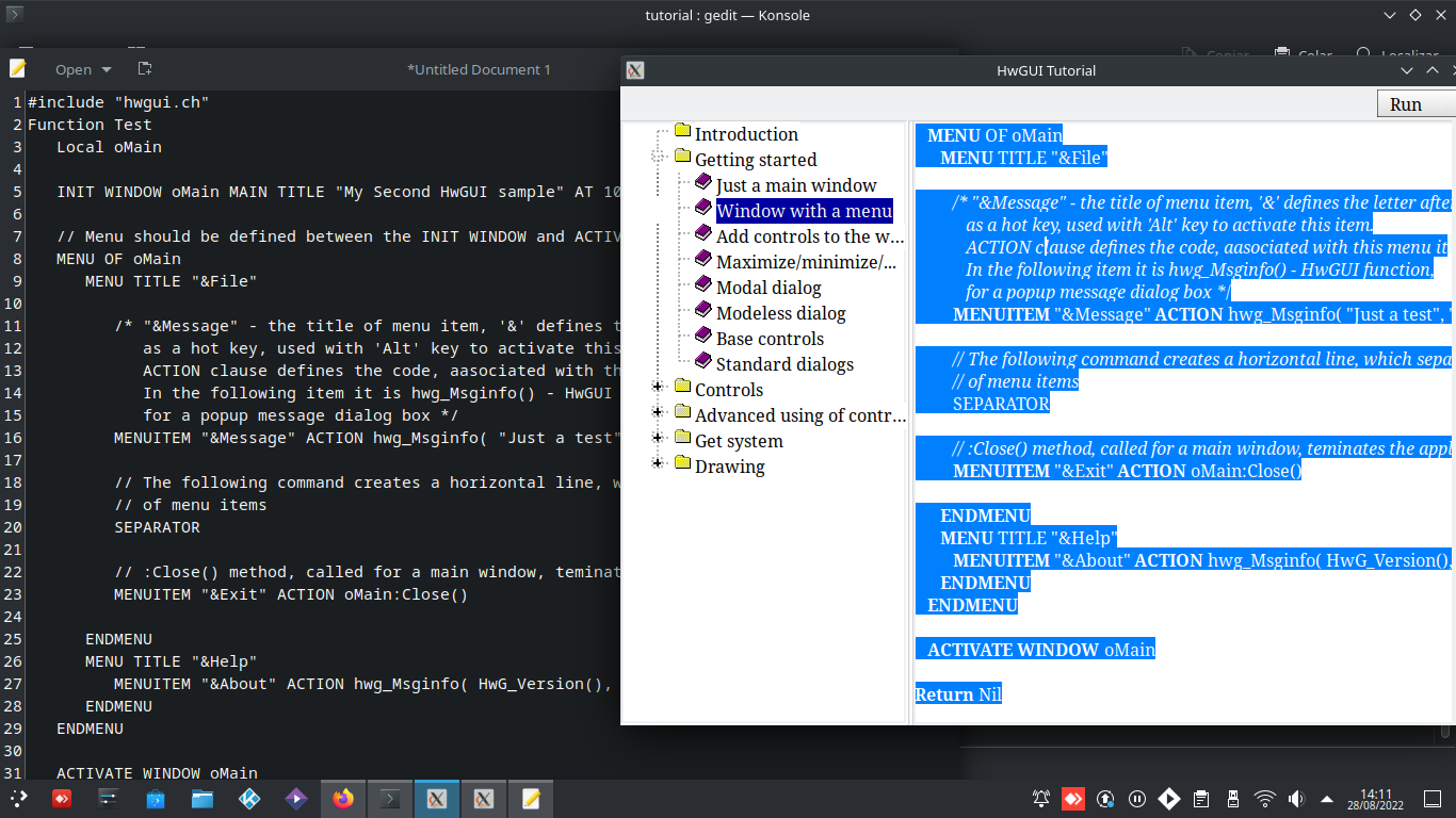 No Linux vc executa ./tutor que tem muitos exemplos já prontos para vc estudar como é.