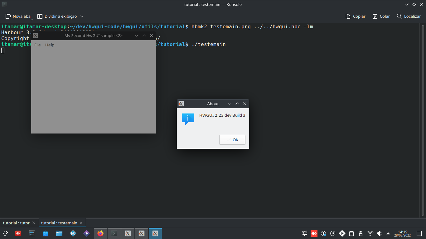 .../tutorial$ hbmk2 testemain.prg ../../hwgui.hbc -lmO tutor, já faz esse processo ai de cima dentro dele.
