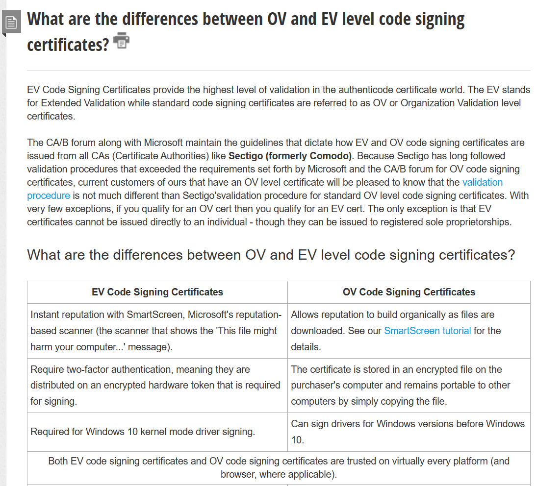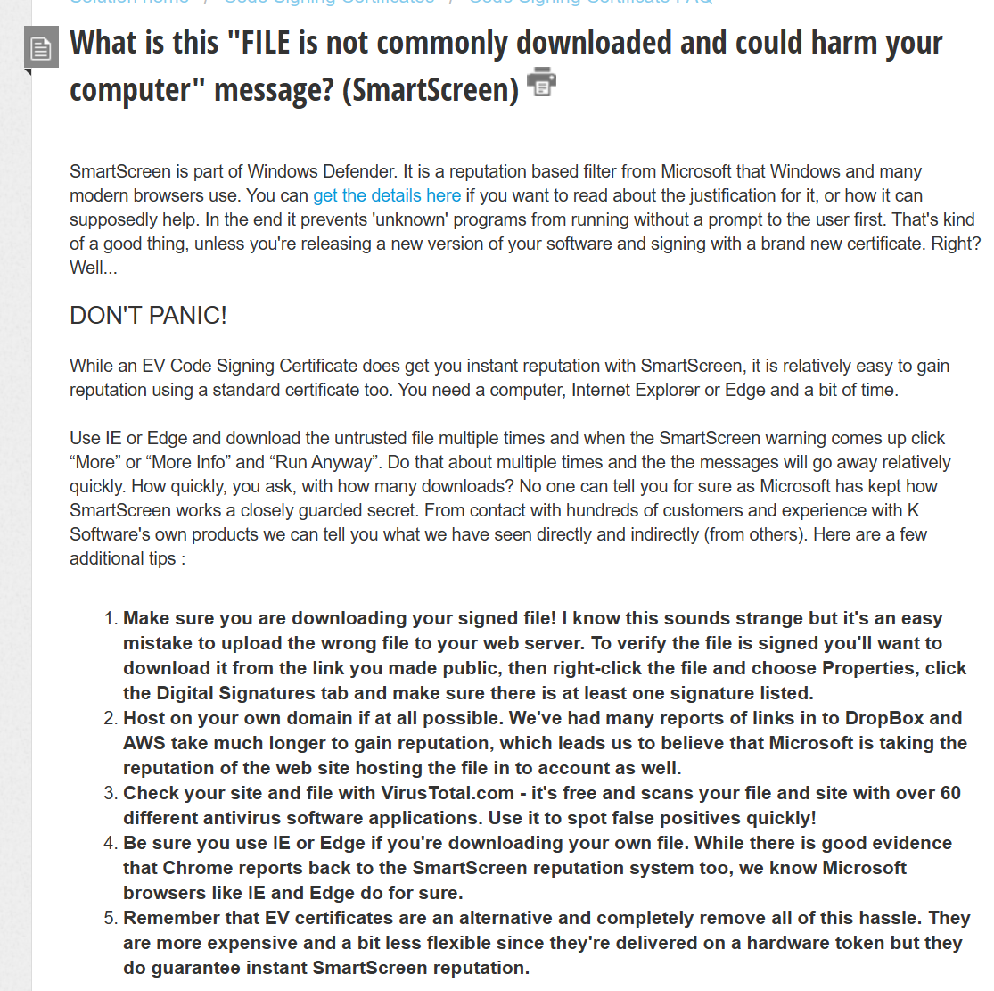 Tenho um programa que fica disponível para download no meu site, sendo um instalador no formado EXE. O problema é que muitos possíveis interessados no programa acabam se assustando com tanto bloqueio que o windows impõe para que o EXE seja baixado e instalado no computador. Muitos já desistem logo de cara pensando se tratar de vírus... Já tentei utilizar com a assinatura do arquivo com uma rotina aqui mesmo do fórum (Rochinha), mas me parece que não influencia na confiança do windows ...