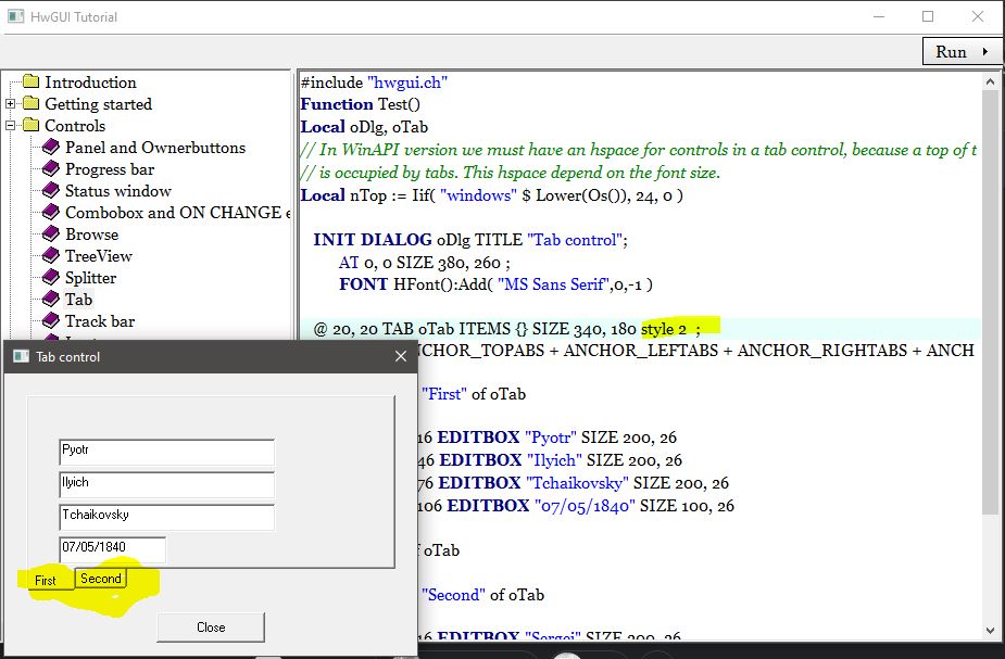 Vários Styles causam este efeito mas não consegui nenhum que colocasse dos lados. Acho que a HwGUI não suporta isto. Teria que alterar algumas propriedades do TABControl não incluídas na lib. Teria que estudar mais o caso. Não sei se style 2 funciona em GTK.