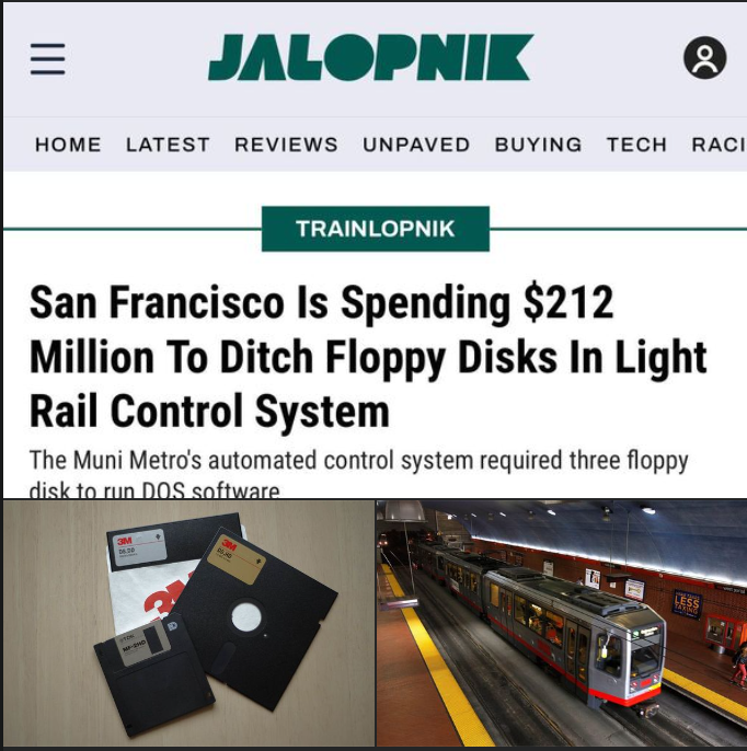 US$ 212 milhões – Investimento da agência de trânsito de São Francisco num sistema de controlo de comboios do metro a funcionar em DOS em disquetes de 5,25 polegadas – tecnologia com 50 anos de idade. O novo sistema estará pronto em 2028, afirma