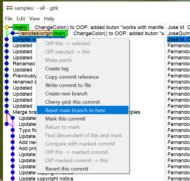 Esse "reset main branch to here" vai servir pra voltar a versão anterior.