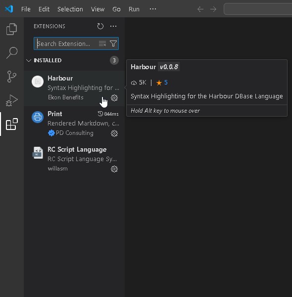 Eu instalo e depois incluo uma extensão para a linguagem Harbour (basta fazer uma busca por "harbour":