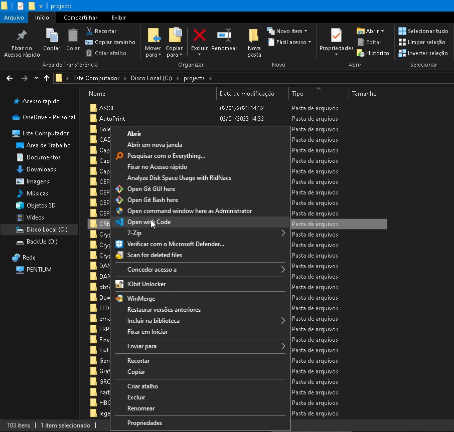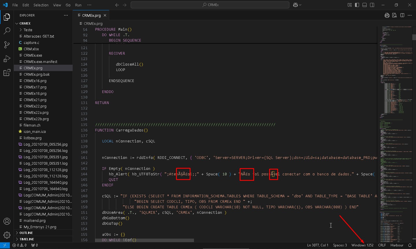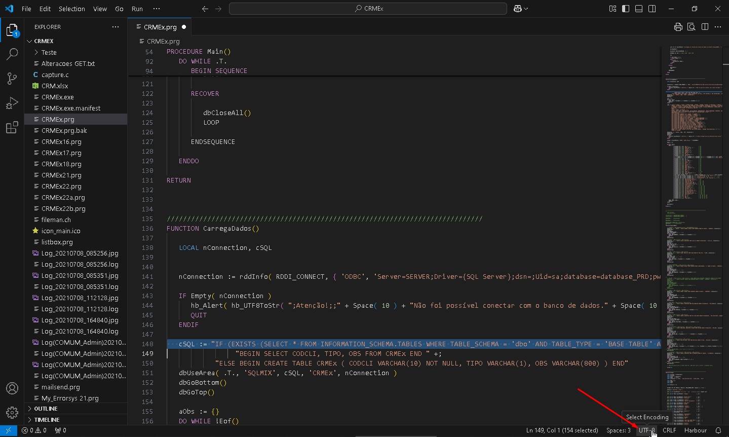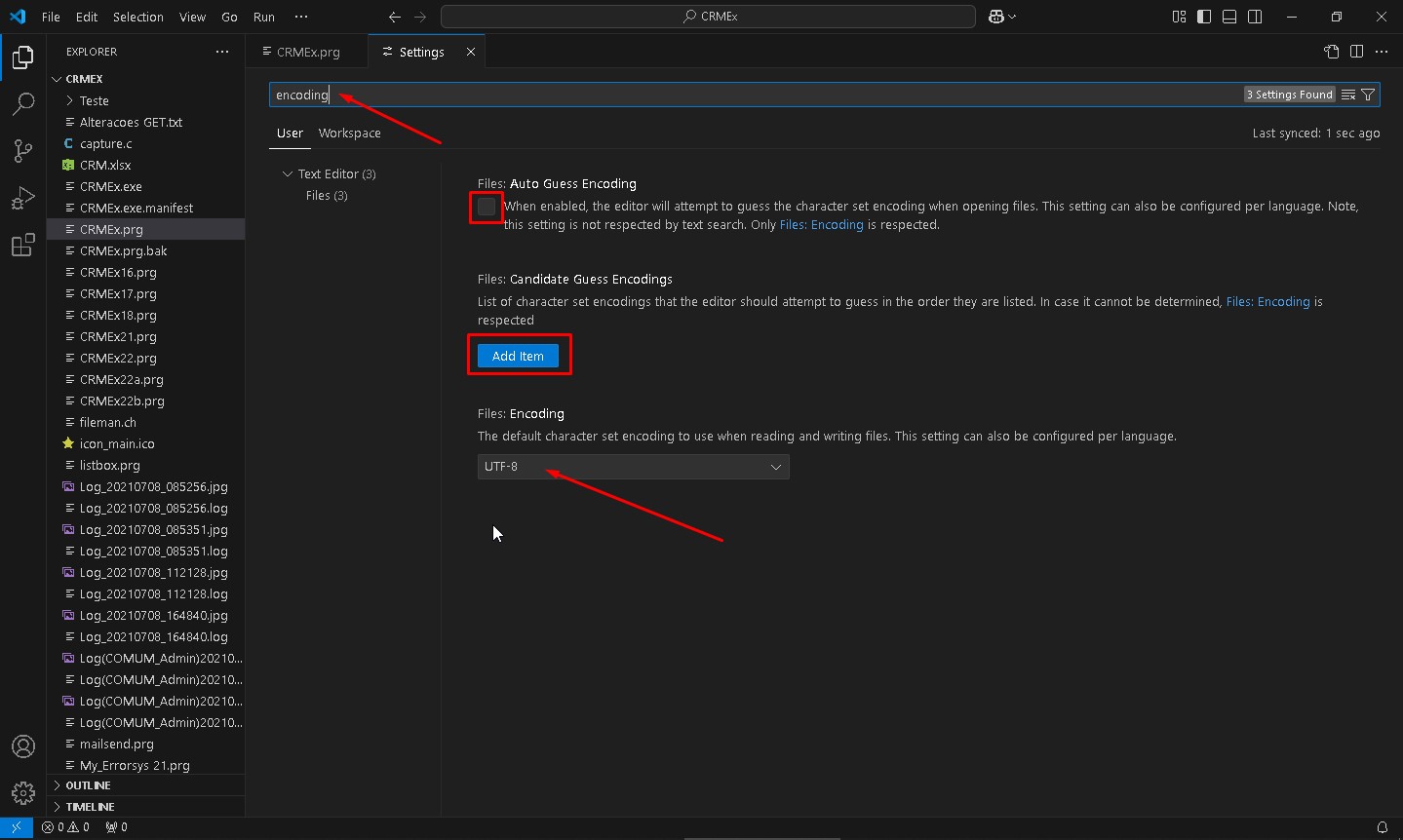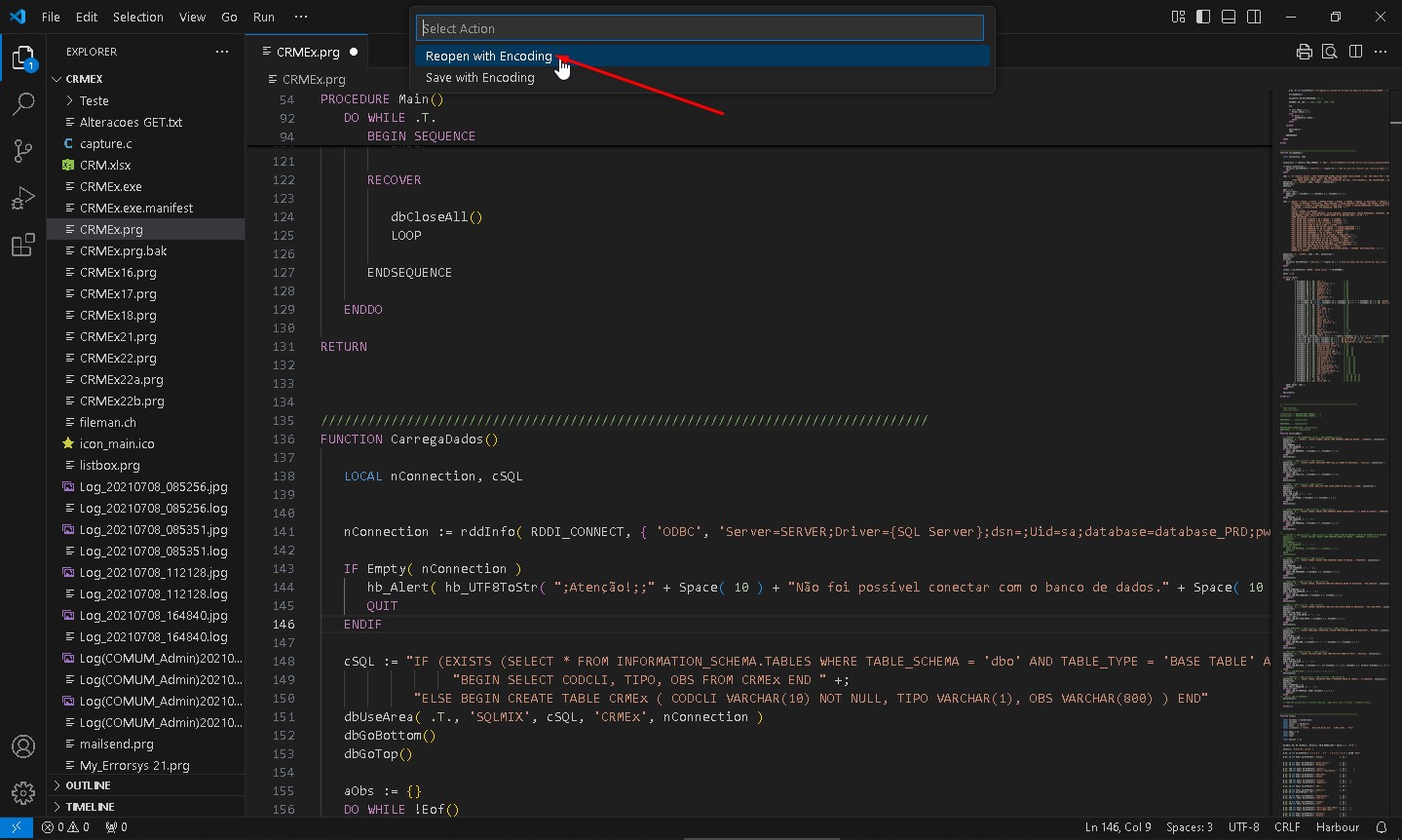Dica extra de como abrir uma pasta inteira do seu projeto dentro do VSCode, assim pode fazer buscas em todos os fontes do projeto: O encoding atual é mostrado na barra inferior, basta clicar sobre o mesmo para alterar daquele arquivo específico: Daí você terá duas opções, abrir novamente naquele encoding ou salvar naquele encoding (eu uso a primeira, evidentemente): Então poderá selecionar em uma lista completa qual o encoding escolhido para abrir novamente aquele arquivo: O arquivo será reaberto no novo encoding (veja na imagem que caracteres especiais foram afetados por isso): Você poderá deixar preconfigurado para sempre abrir/salvar em um encoding específico (ou tentar descobrir automaticamente): Didigite "encoding" para achar a configuração que deseja alterar, note que tem a opção "Auto Guess Encoding" onde o VSCode vai tentar descobrir qual é o encoding correto automaticamente (já usei mas não funciona 100% - erra em vários casos...)