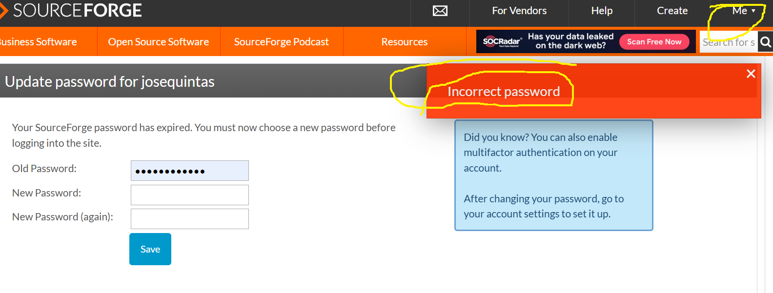Haviam 3 senhas salvas no Edge pra o sourceforge, como no firefox é obrigado a digitar, uma outra senha funcionou.