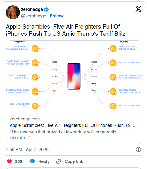 Ao aumentar os voos fretados de carga aérea, a Apple transportou aproximadamente 600 toneladas de iPhones — o equivalente a cerca de 1,5 milhões de unidades — da Índia para os Estados Unidos para vencer a ofensiva tarifária do "Dia da Libertação" do Presidente Trump.