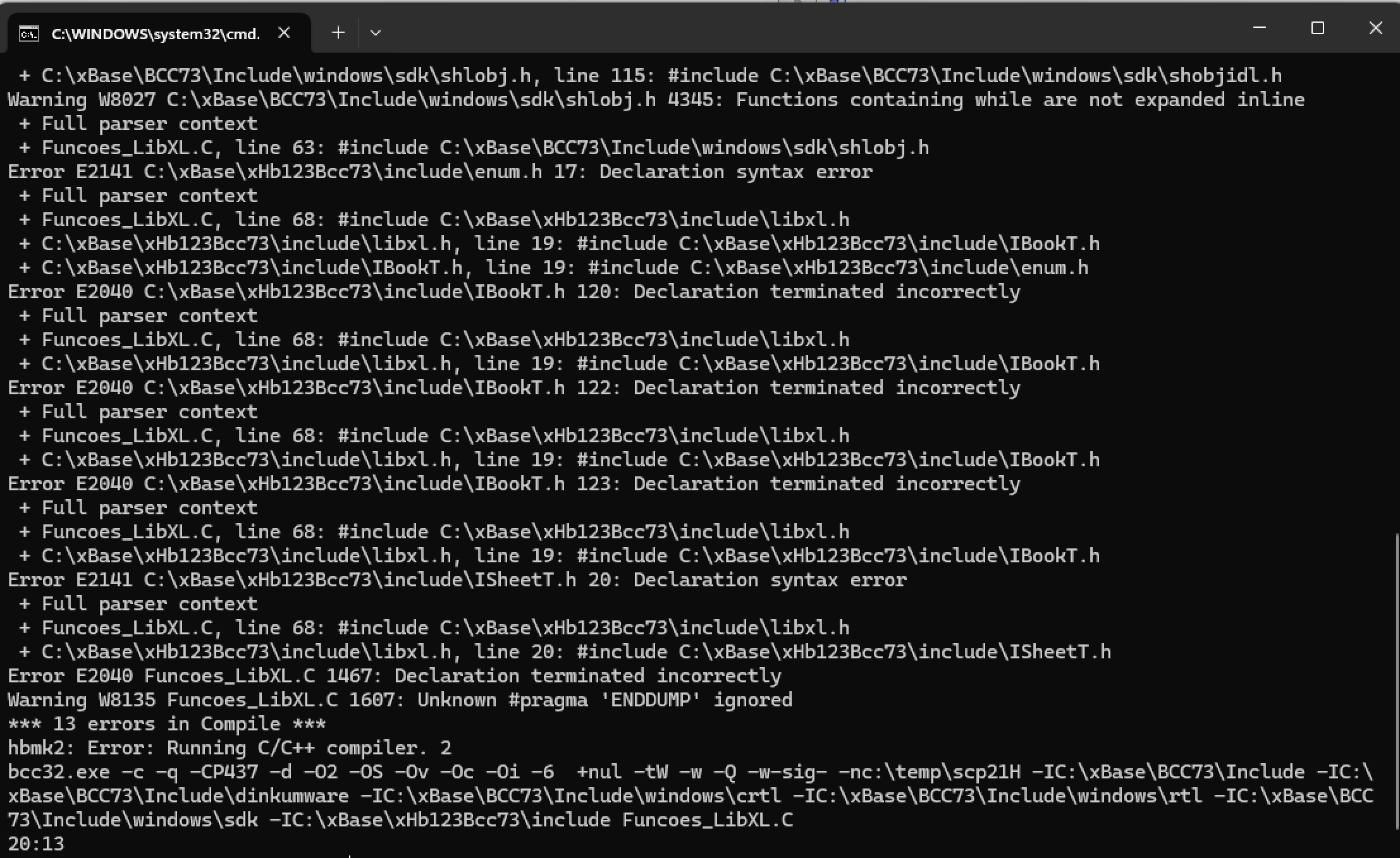 Error E2040 Funcoes_LibXL.C 1460: Declaration terminated incorrectly