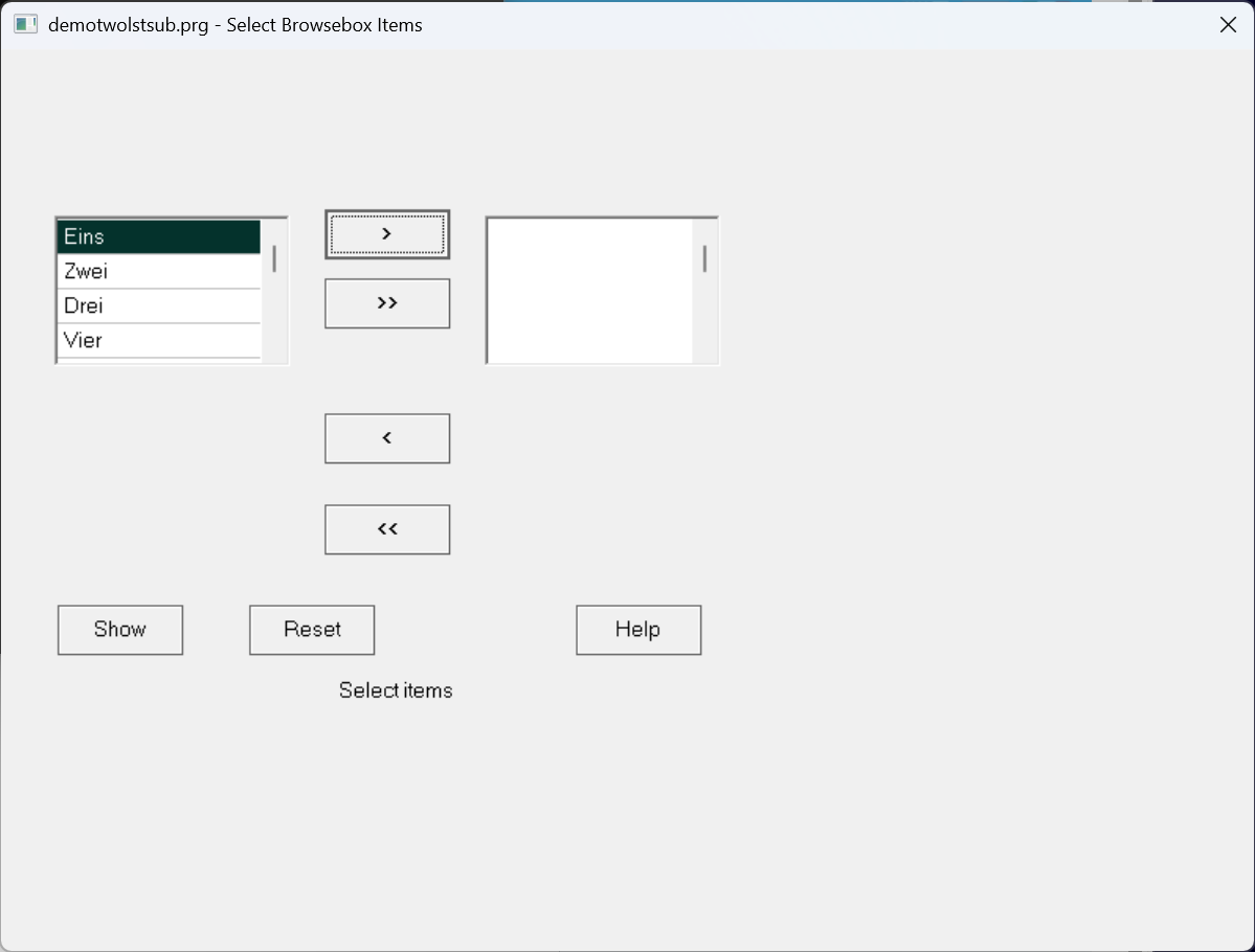 TITLE "demotwolstsub.prg - Select Browsebox Items" ;