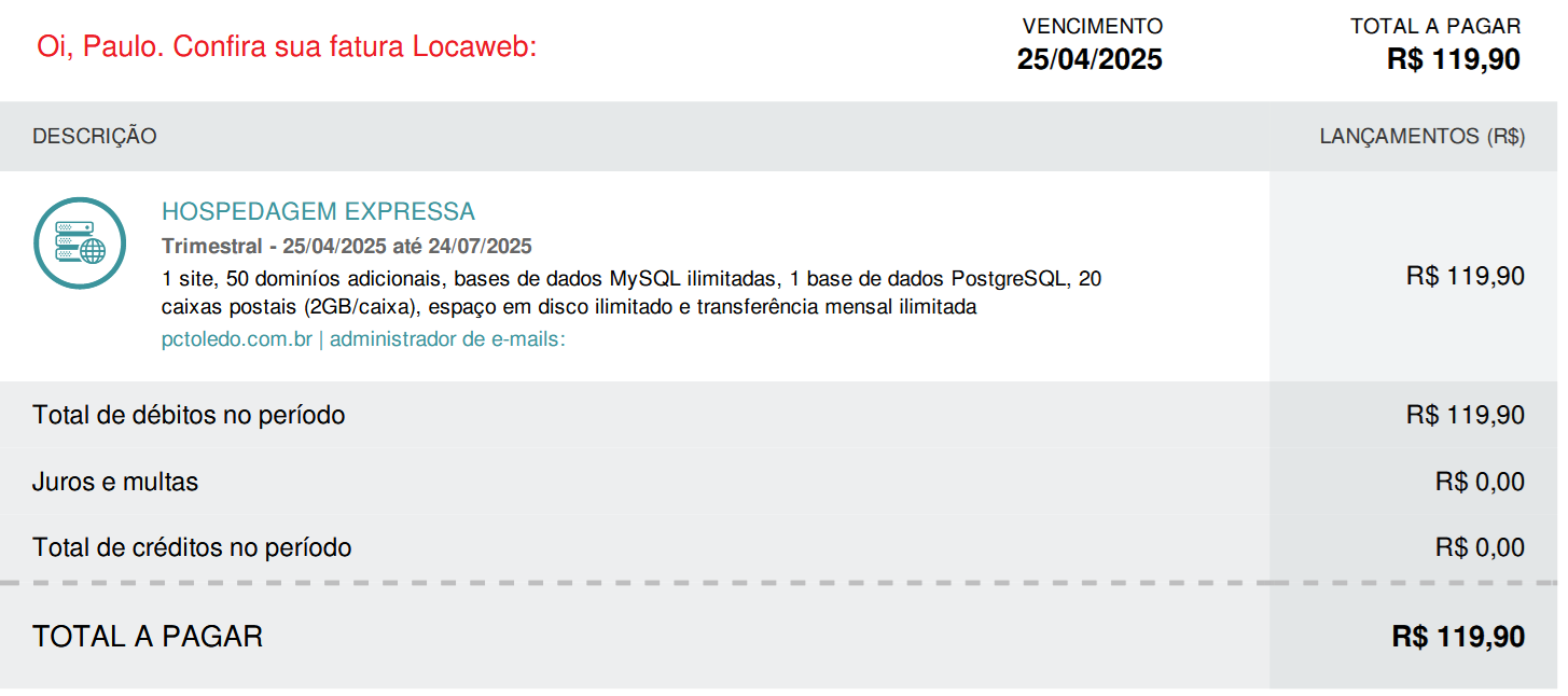 Gostaríamos de informar que a fatura da sua conta Locaweb, com vencimento para o dia 25/04/2025, está disponível.