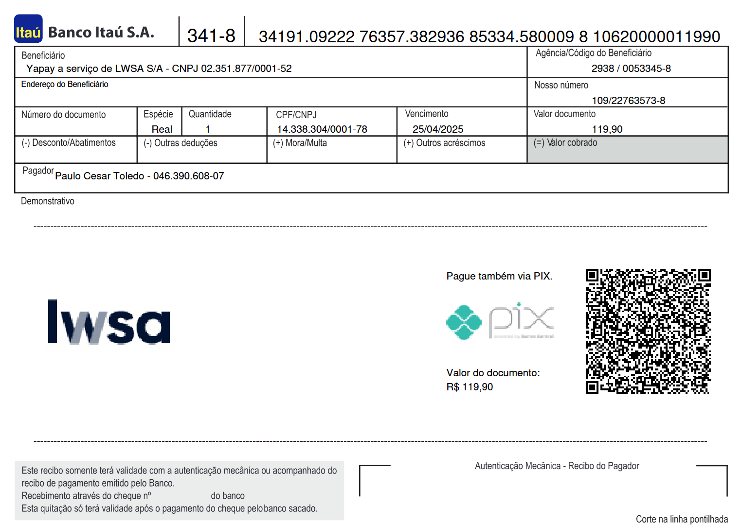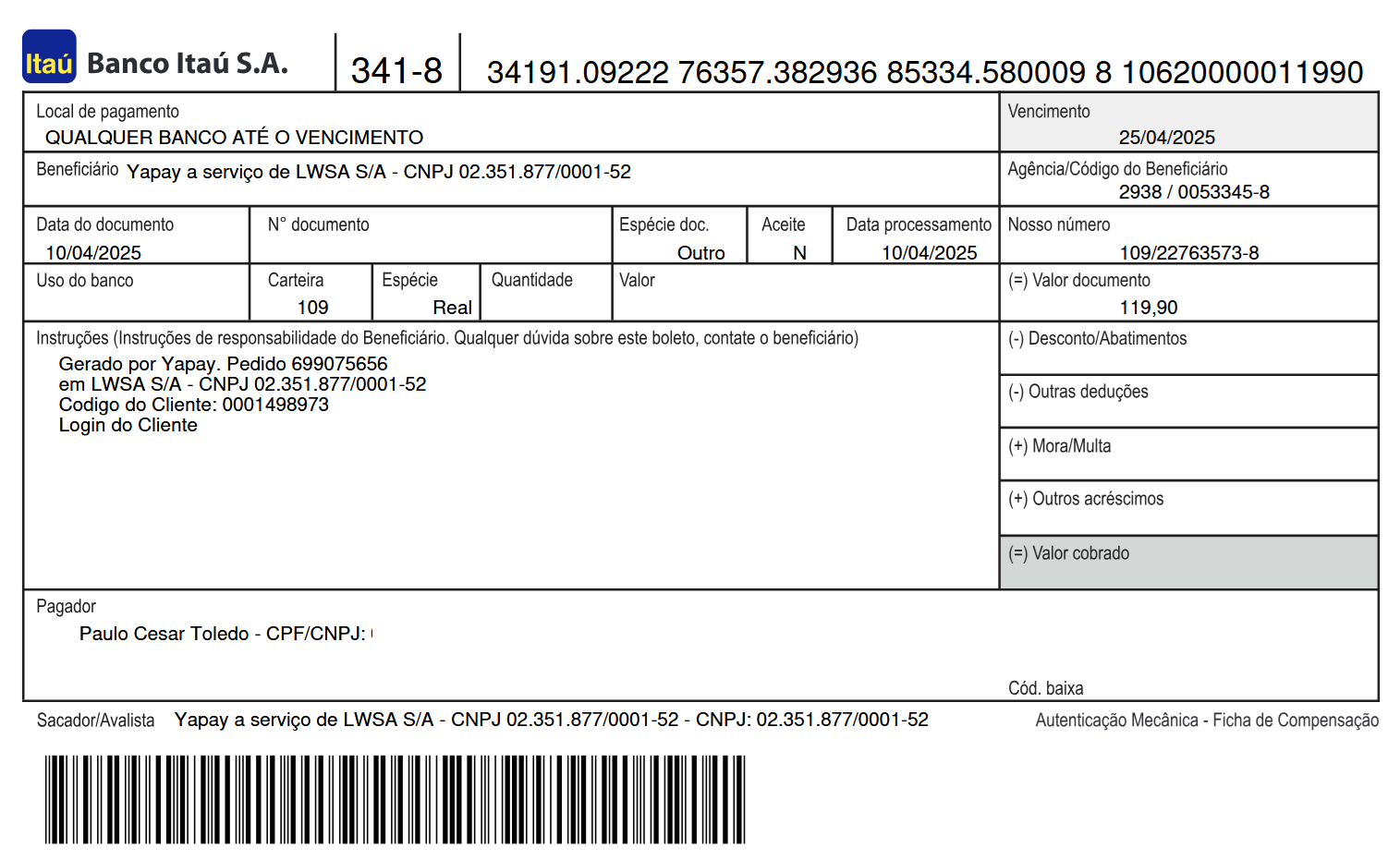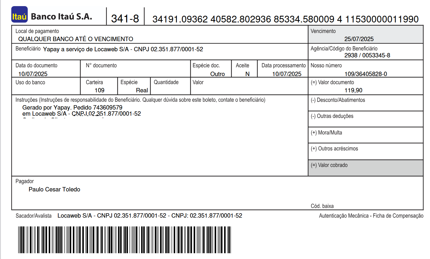 Valor Nominal do Boleto: 119,90