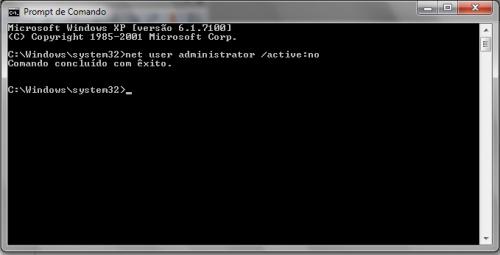 Pronto!! A conta agora está ativada, inclusive na tela de boas-vindas. Não esqueça de definir uma senha para conta ativada, evitando assim, o acesso a qualquer usuário. Para desfazer as alterações, refaça o mesmo procedimento, com uma pequena alteração, substituindo a parte final do comando indicado no ítem 4 de yes para no