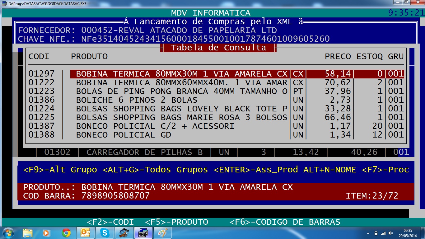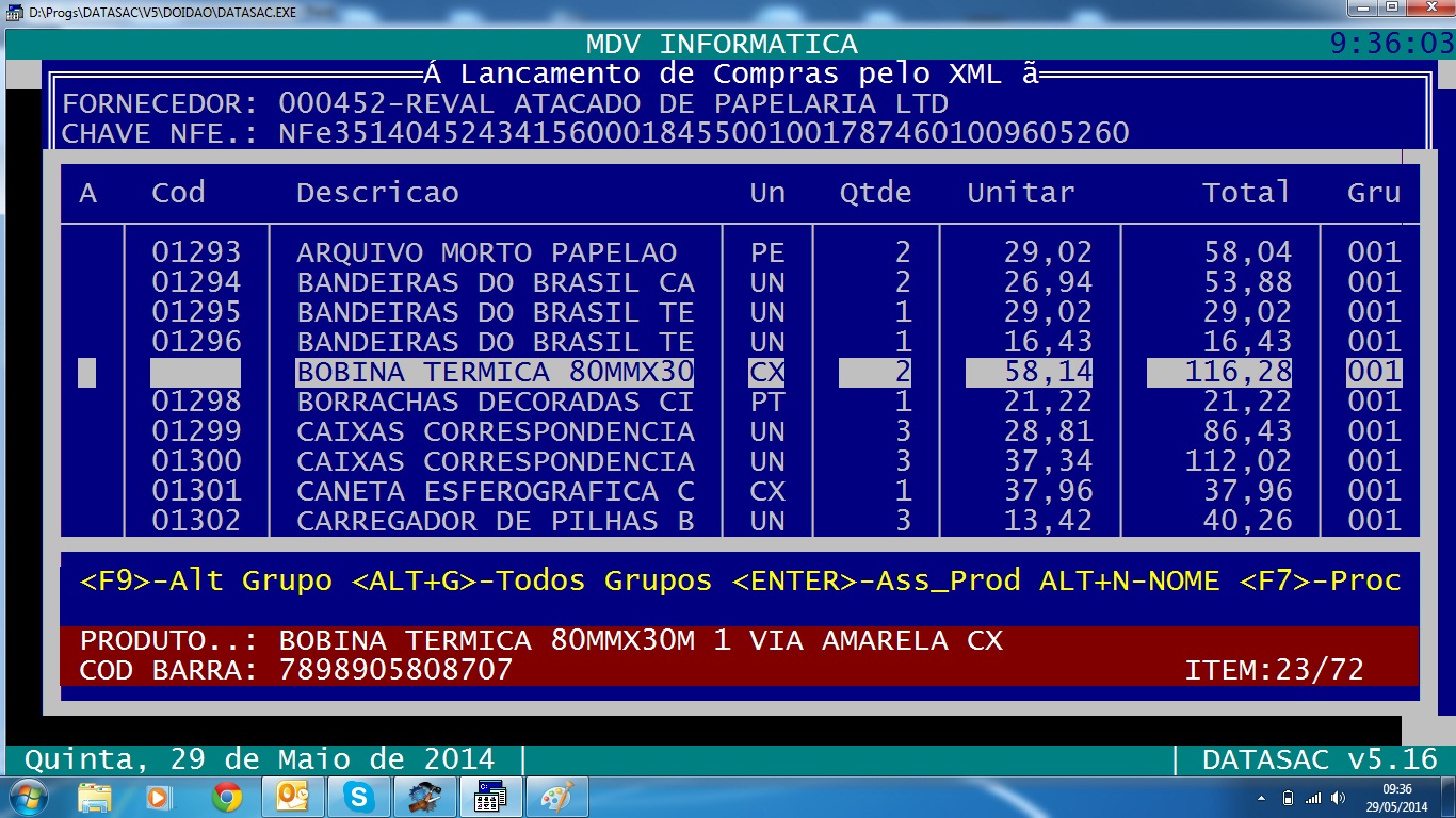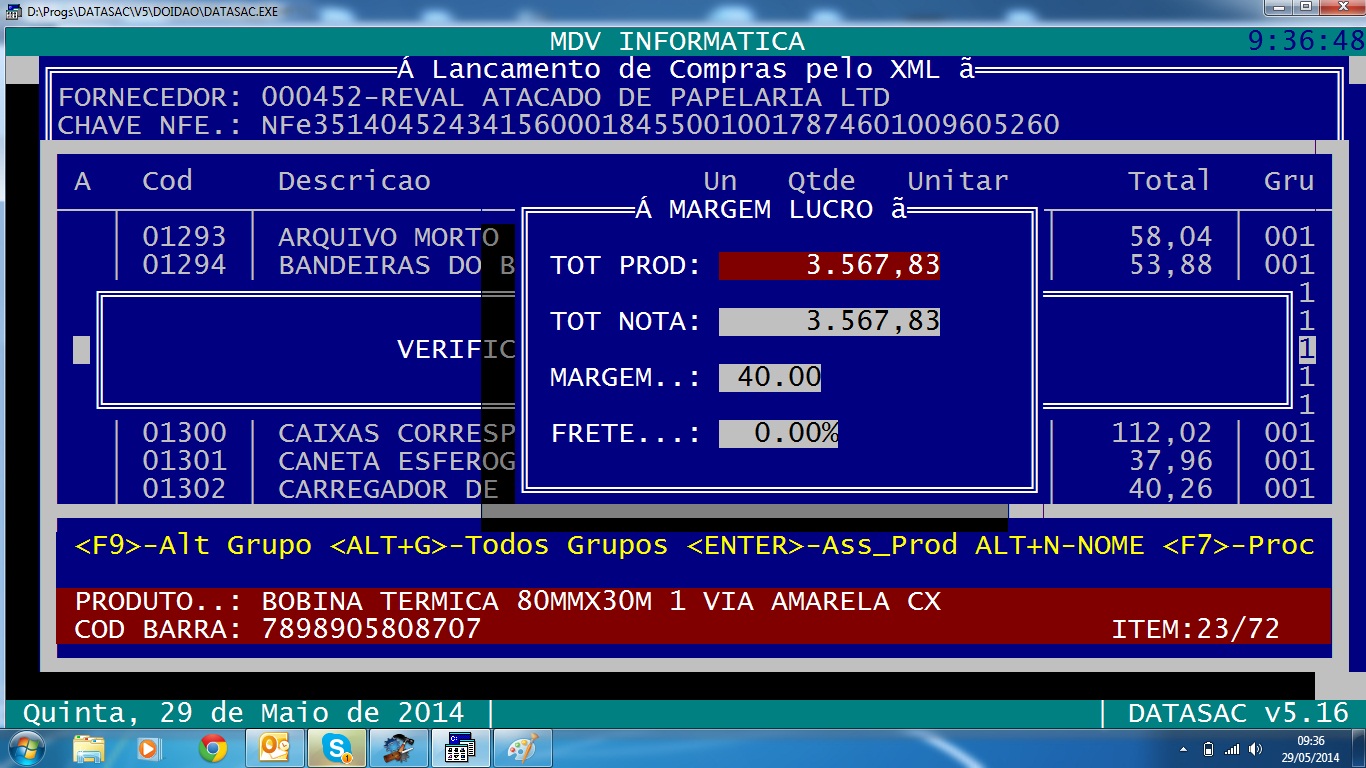 Depois é exibido uma tela com os itens do xml. É feita uma pesquisa com o código de barras do item. Se for encontrado no cadastro de produtos o sistema associa automaticamente senão ele pesquisa novamente pelo fornecedor e o código original do item. Se não encontrar o usuário seleciona em qual grupo ele quer cadastrar o produto e o sistema efetua o cadastro do produto automaticamente conforme regras prédefinidas. O usuário pode tb associar o item a um produto cadastrado como mostra a tela abaixo Ao final da verificação dos itens o usuário pressiona F7 para processar a compra. É apresentada uma tela mostrando os valores totais da nota e pede a margem de lucro e o frete (se tiver o valor de frete na nota já é buscado automaticamente senão poderá ser definido). É claro que os dados que vão ser coletados do xml vai depender de sistema para sistema. Os meus clientes estão muito satisfeitos porque ao final imprimo um espelho da nota com codigo original + codigo gerado pelo sistema + descricao + valor e codigo de barras. Daí o usuário somente fará a conferência e outro usuário com poder de composição de preço de venda revisa, mas não precisa digitar nenhuma informação adicional, como código de barras, ncm e etc. Somente preços. O próximo passo agora é selecionar e coletar informações do sped fiscal e sped pis cofins... mas aí é outra história..