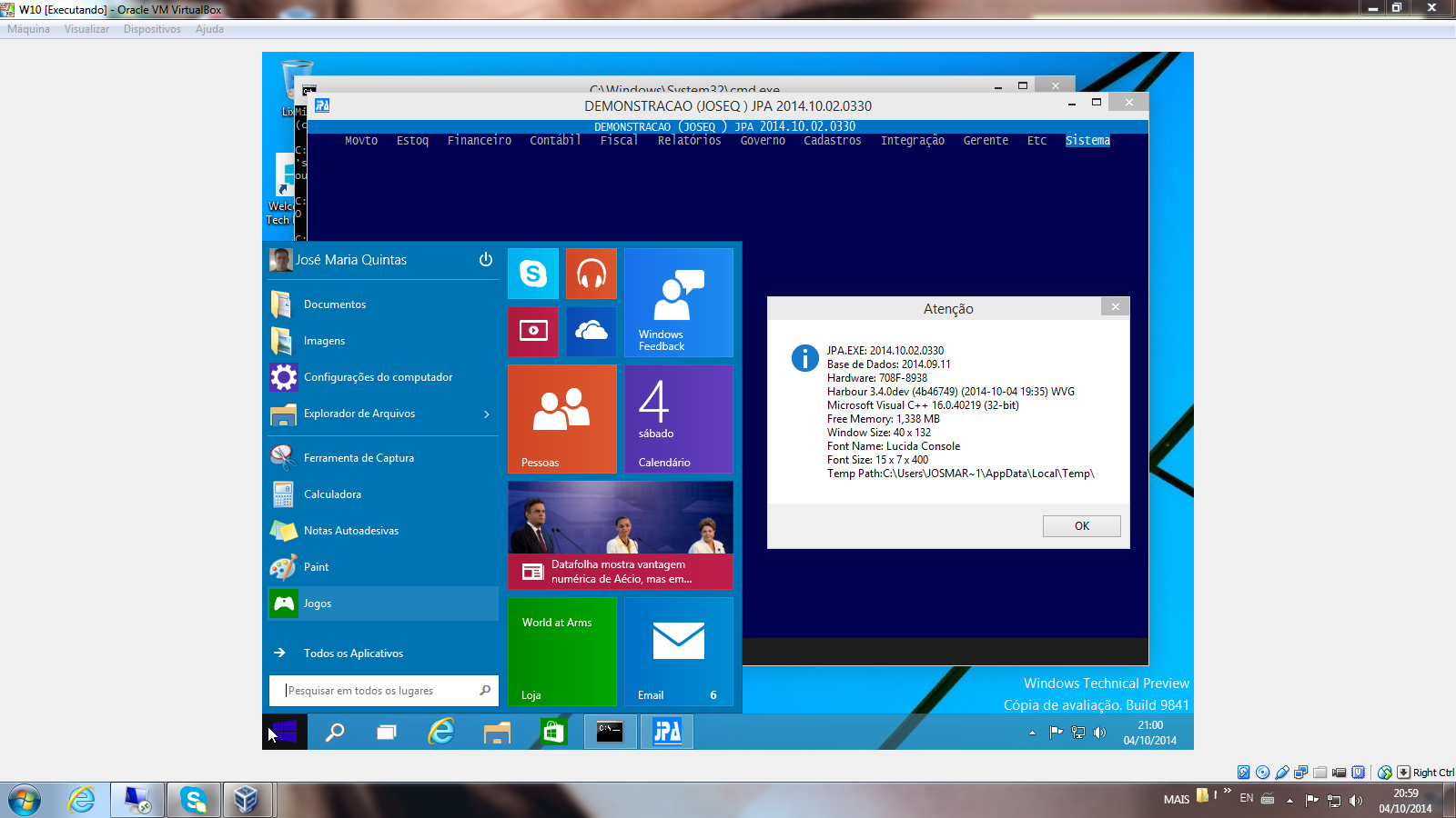 Instalei o Windows 10 (32 bits) usando Virtual Box.