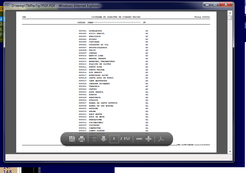 Na janela final, ao colocar o mouse sobre o relatório abrem opções de salvar/imprimir, e também a opção de mostrar todo o menu, até mesmo a opção de enviar por email (opções do Reader e não do explorer).