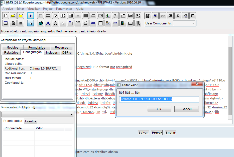Bom dia meus caros professores. Desculpem minha péssima forma de relatar os problemas, não estou acostumado ainda com o fórum, isso aqui é novidade para mim, me perdoem. Após a dica do mestre Pablo fui ver os arquivos build e error e lá está a chave do problema. Eu utilizo em meus sistemas uma biblioteca .LIB a qual eu indiquei o path na HMG C:/hmg.3.0.35/PROD/TOR2000.LIB Acontece que o erro está por ai. Tem alguma medida a tomar ?
