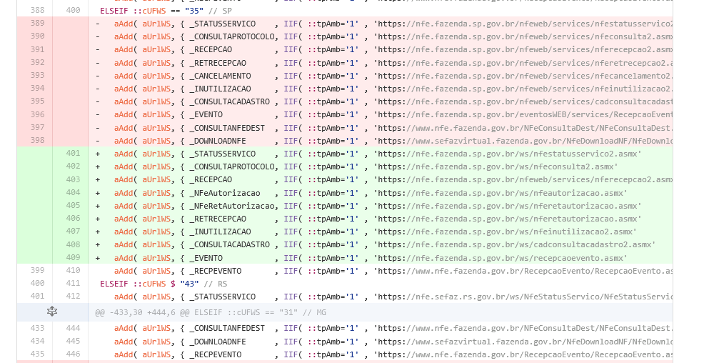 Linhas retiradas com (-) e linhas adicionadas com (+)