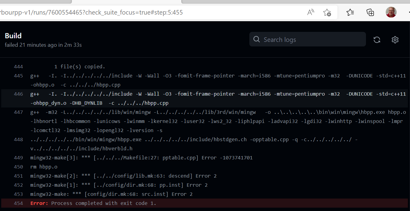 Visto que o MinGW é 64-bit e o Harbour++ está sendo gerado em 32-bit, os executáveis da pasta bin do Harbour++ precisam achar as dll's 32-bit do MinGW. Se não acharem, dá erro conforme ocorreu com o hbpp.exe.