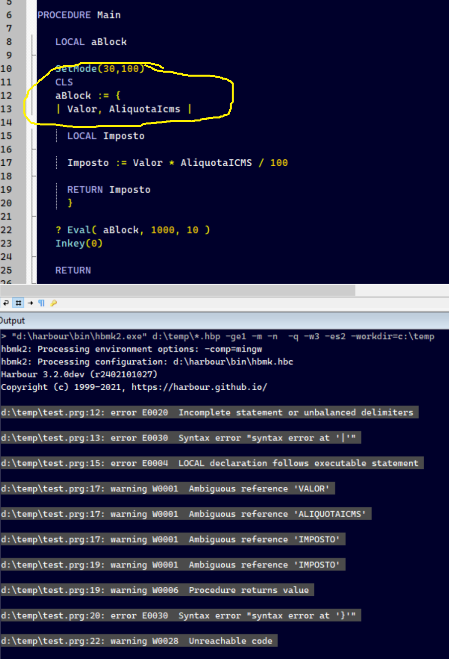 test.prg:18: warning W0007 Function '{||...}' does not end with RETURN statement